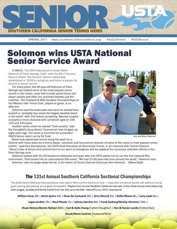 History: The Southern California Tennis Association was the first of the USTA’s seventeen sections to produce a publication solely for competitive senior players. The Senior News covers a broad variety of topics. The Senior News Archives are available to those who are looking for information concerning individuals, tournaments and basically anything pertaining to senior tennis in the section.